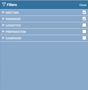 To show different events, click on the side filter and choose the events to display in your calendar. By unticking items, they will no longer be displayed.