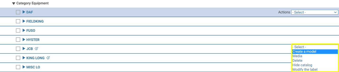 To create a model, go to the PRODUCTS menu and hover your mouse on the relevant brand to activate the Actions menu. Click on Create a model.