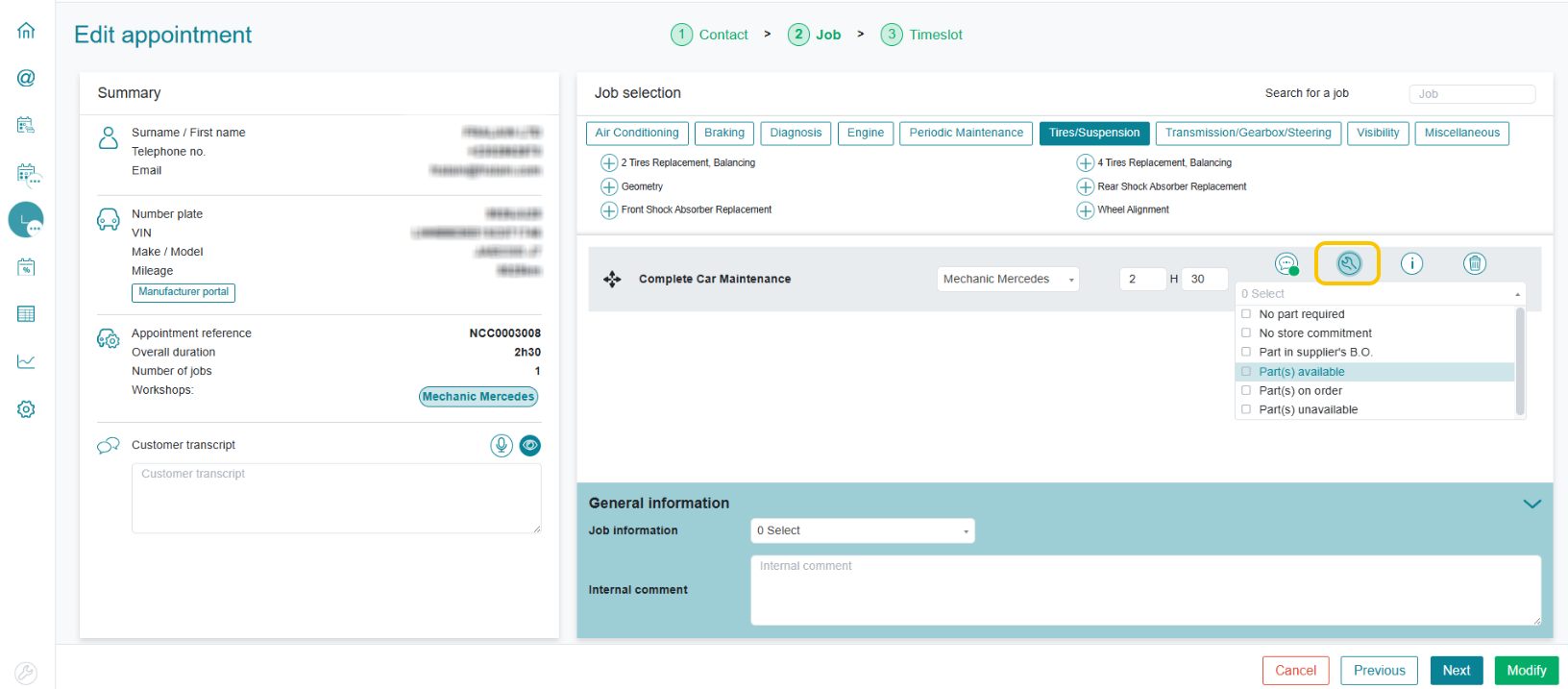 To do this, use the pencil button to edit. On the job page, click on the spanner and select the parts availability status.