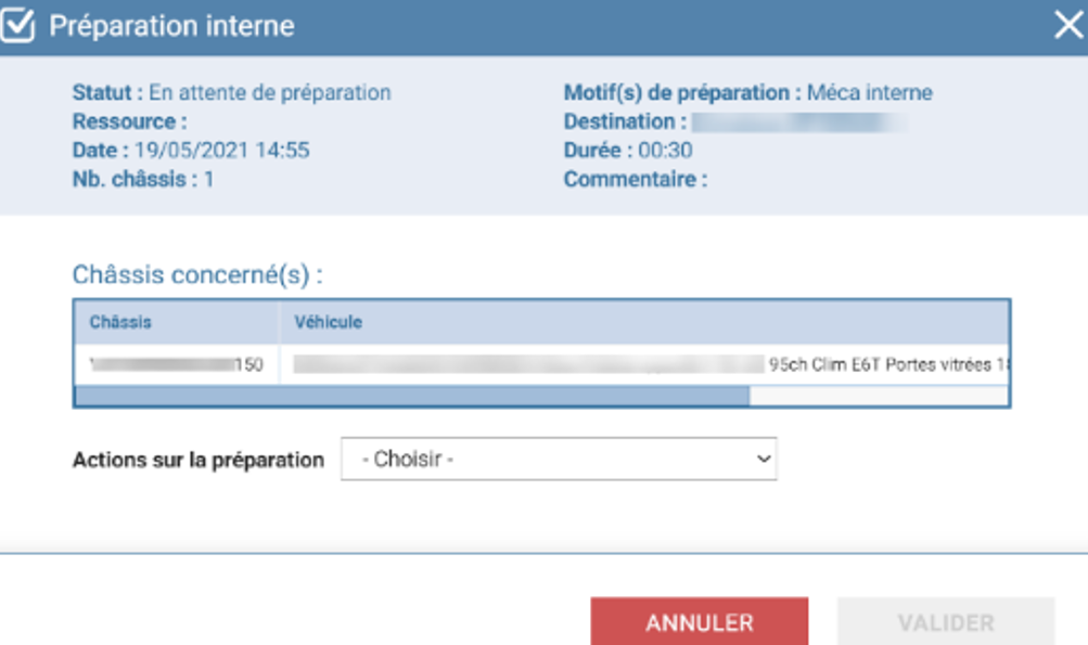 Sélectionnez-le(s) châssis. Dans le menu Actions, sous la rubrique OPÉRATIONS LOGISTIQUES, cliquez sur Modifier la demande de préparation. Ainsi la fenêtre de préparation s’ouvre et vous pouvez la modifier.