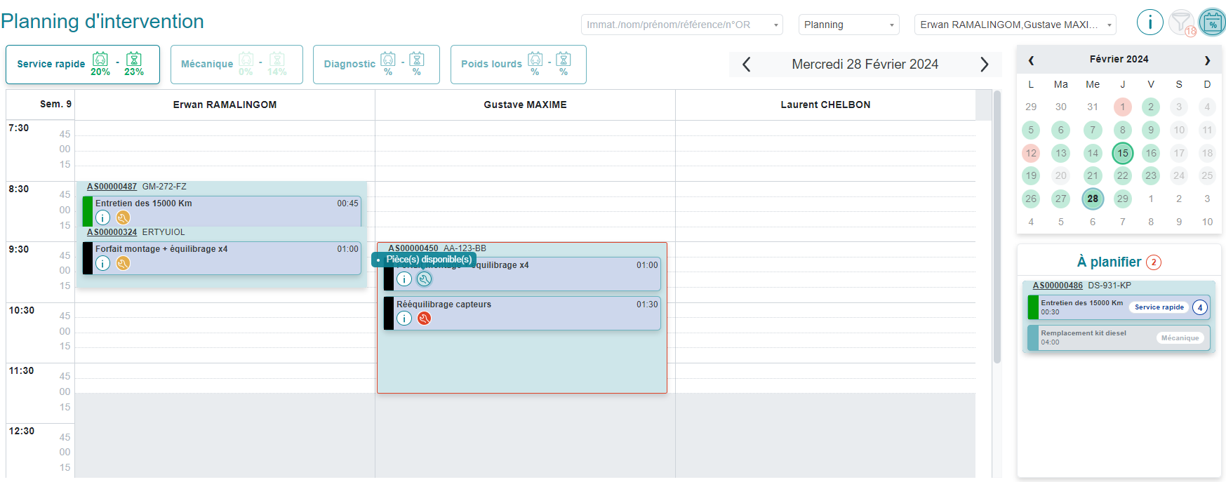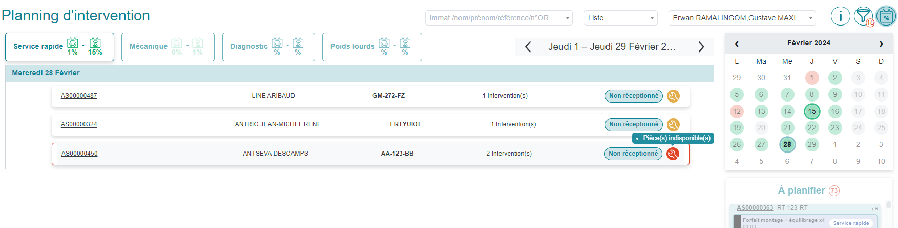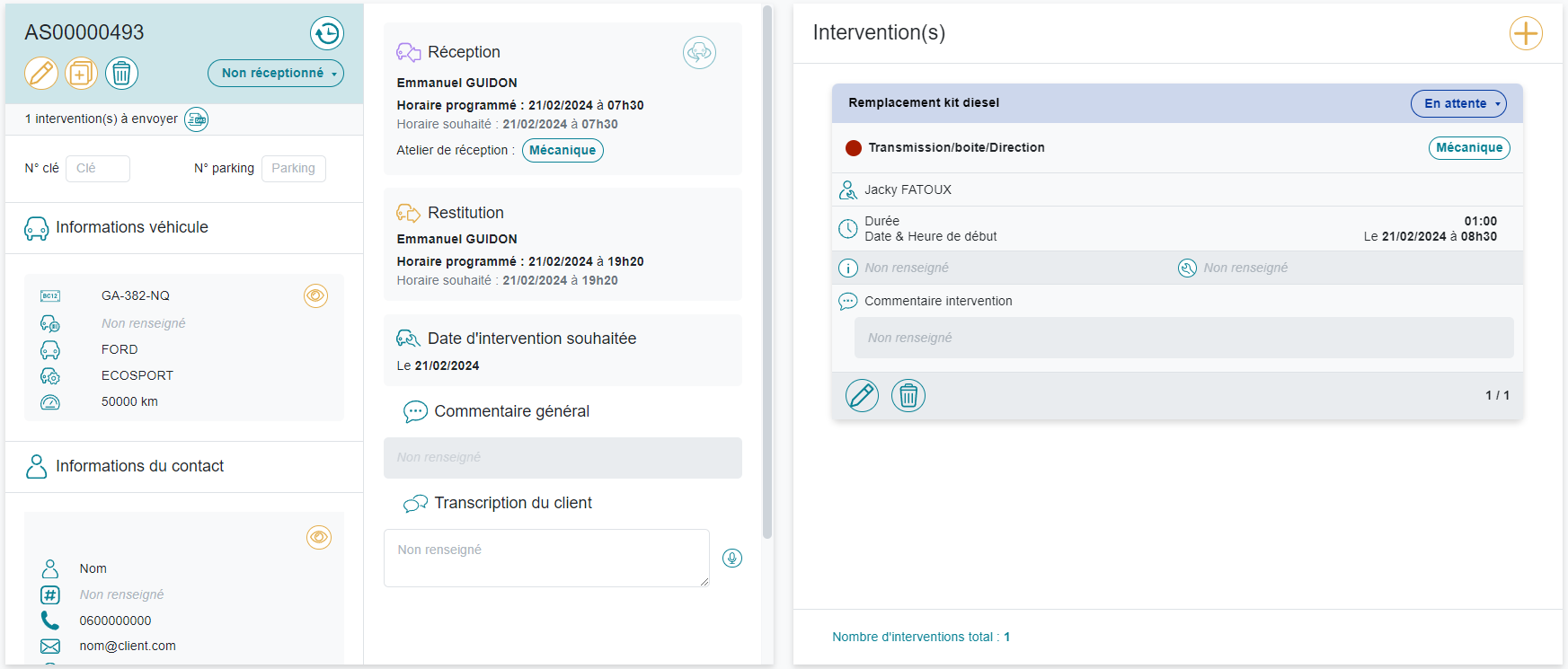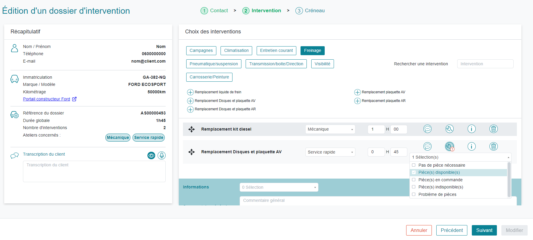 La disponibilité des pièces peut être renseignée à partir du dossier d'intervention.
