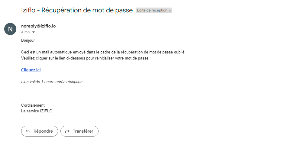 Dans le cas où vous avez oublié votre mot de passe, vous pouvez le réinitialiser grâce à votre adresse e-mail sur la page de connexion à iziflo.
