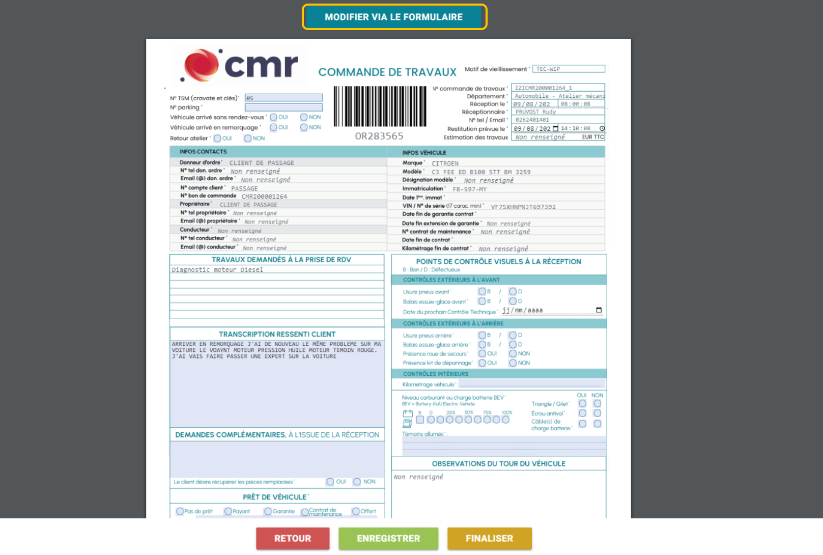 Une fois la confirmation effectuée, vous pouvez modifier la commande de travaux :