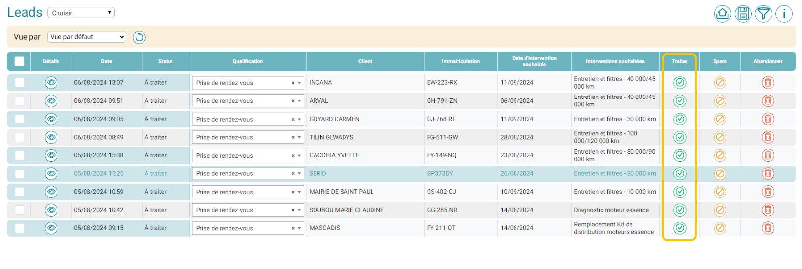 Pour traiter ce lead, cliquez sur le pictogramme de la colonne Traiter :