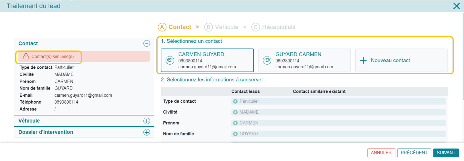 En cas de doublon de contact, il vous sera proposé de sélectionner un contact déjà existant correspondant aux critères de la personne issue du lead ou de créer un nouveau contact :