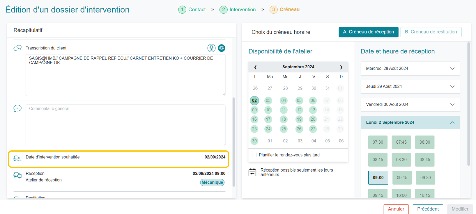 Après sélection de la date et des heures de réception et restitution, cliquez sur Modifier pour valider la création d'intervention. Celle-ci s'affiche :