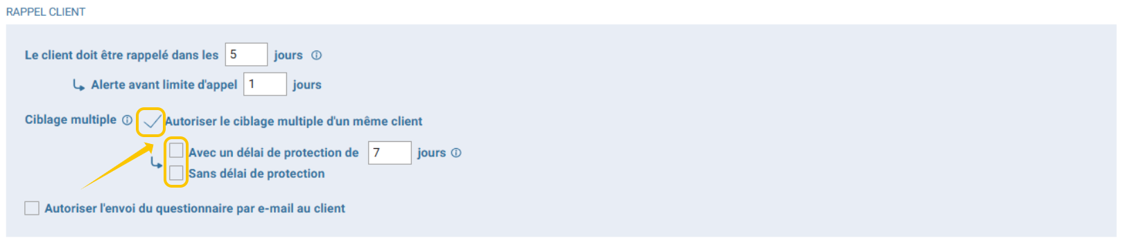 Dans la section "Rappel Client", il est possible de cocher l'autorisation de ciblage multiple.