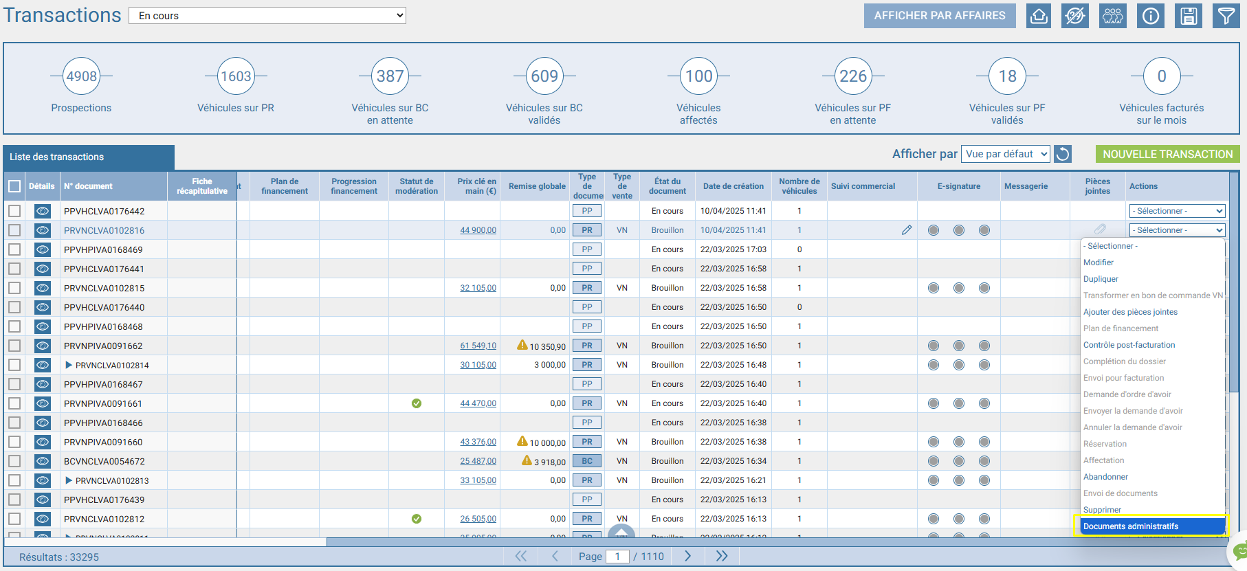 Dans les affaires > actions, sélectionnez "documents administratifs". Une modale vous permet de choisir "contrat d'entretien" ou "extension de garantie" si un service a été ajouté au document.