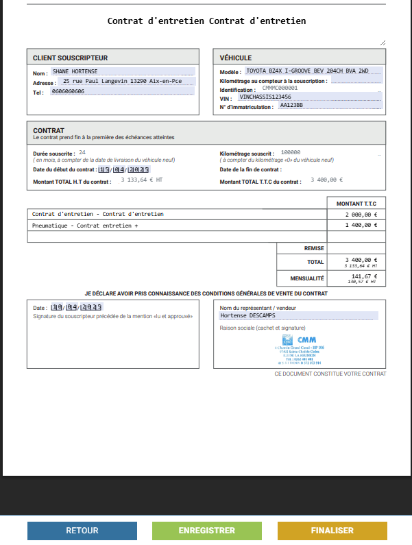 Une fois le type de document sélectionné, vous pouvez modifier le PDF avant de le signer, le tout sur iziflo. Les informations disponibles dans iziflo, comme le VIN, sont ajoutées automatiquement sur le contrat d'entretien.