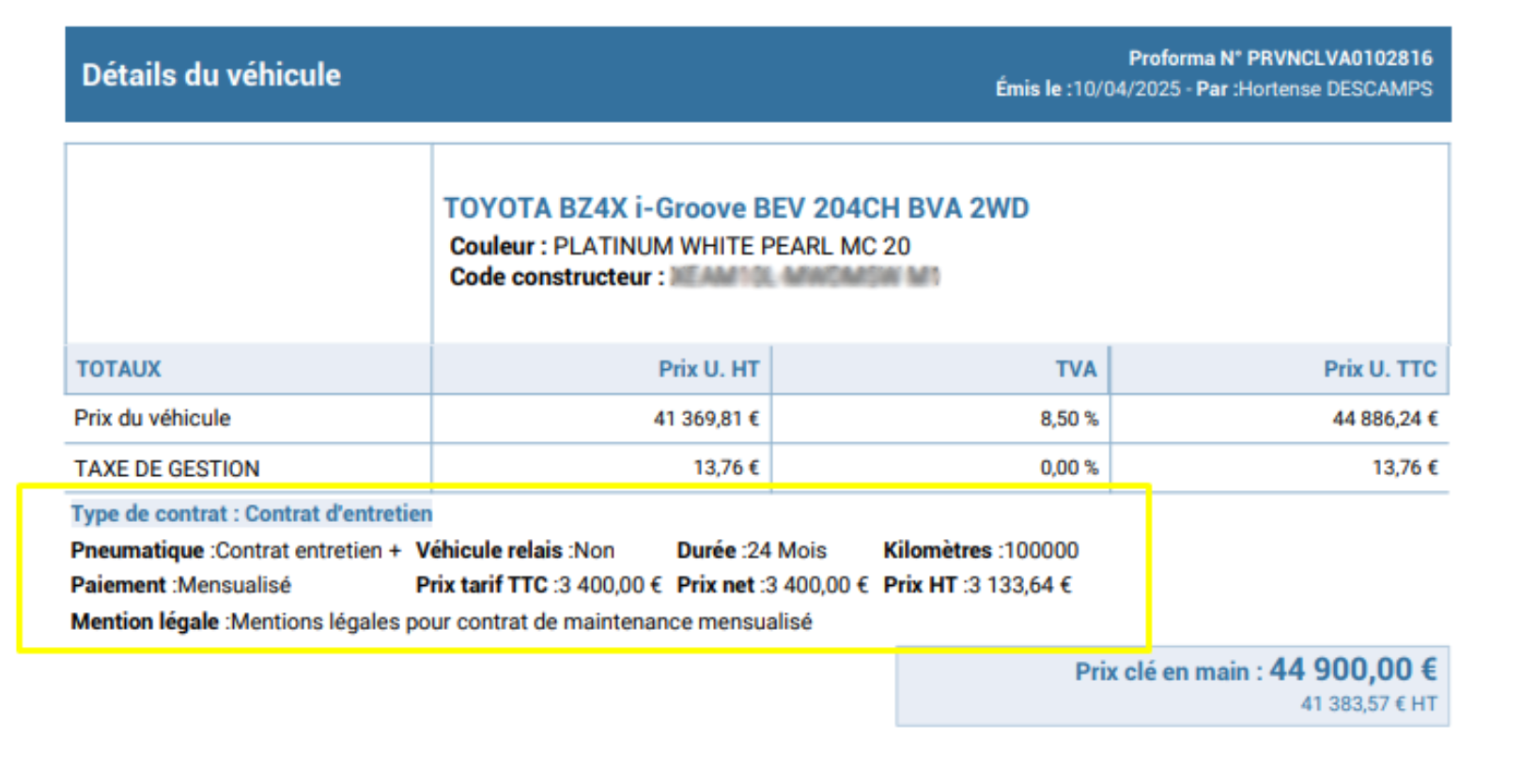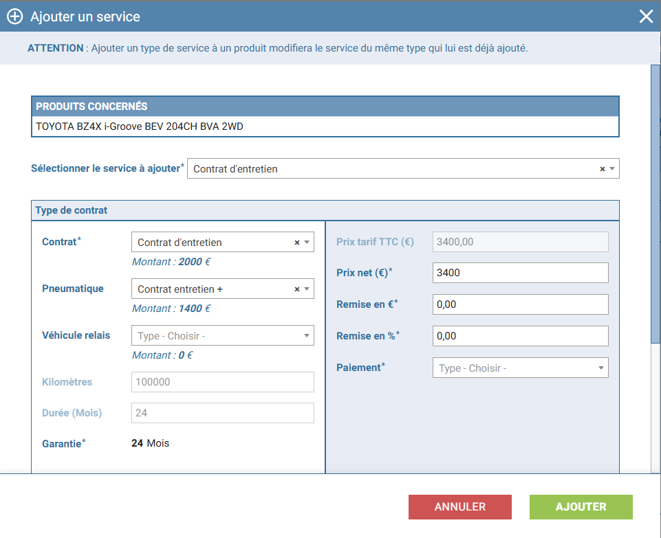 Les contrats d'entretiens / extensions de garantie disponibles apparaissent dans une liste déroulante.